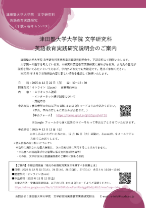 津田塾大学大学院文学研究科修士課程英語教育実践研究では、12月に本研究説明会と冬期集中講座を実施します。